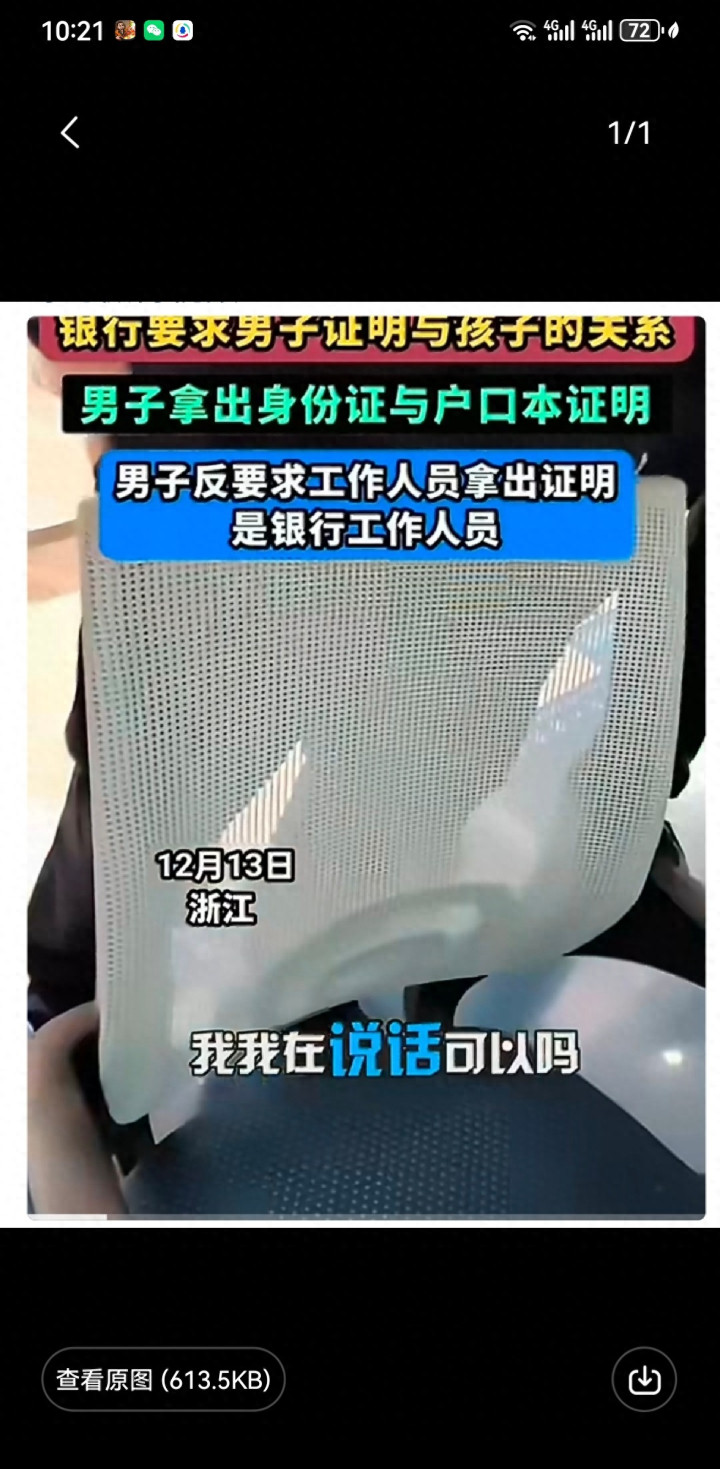 12月13日浙江某银行发生的一幕冲上热搜:一位父亲带小孩办理业务时,被工作人员要求提供亲子关系证明。男子当场掏出身份证和户口本,随后反将一军:“请你们先证明自己是银行员工。”这场“以彼之道还施彼身”的交锋,让围观群众直呼过瘾。